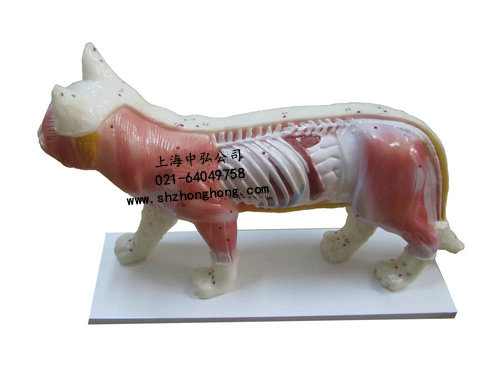 本模型顯示貓體左半部36個常用穴位,穴位用數字標注。右半部顯示解剖面。用PVC制成,供獸醫(yī)作參考用。