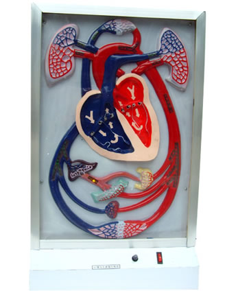 產(chǎn)品介紹: ZH/D26心臟搏動(dòng)與血液循環(huán)電動(dòng)模型適用于中學(xué)及大專院校講解人體血液循環(huán)課程時(shí)作直觀教具,解決教學(xué)時(shí)的重點(diǎn)和難點(diǎn),幫助學(xué)生了解心博周期和血液循環(huán)的途徑。 一、示教內(nèi)容: 1、模型按人體冠狀面位置,能表示心臟、瓣膜、肺臟、腎、胃、腸等器官在人體中的相對(duì)位置,為了突出演示血液循環(huán)和心博周期,把有些臟器作了縮小或放大和適當(dāng)移位。 2、本模型采用機(jī)電原理,能生動(dòng)、形象、準(zhǔn)確地反映出血液循環(huán)的基本原理和心臟博動(dòng)周期。 3、本模型采用透明塑料制作,加上顏色的噴寫,通過電燈光的閃爍,可明顯顯示出體循環(huán)、肺循環(huán)、動(dòng)脈血和靜脈血的顏色的相互轉(zhuǎn)化及心肌的瓣膜的周期博動(dòng)。 二、模型結(jié)構(gòu): 1、心臟博動(dòng)與血液循環(huán)電動(dòng)模型的心臟采用軟塑料,其它血管、臟器用透明塑料成型,通過噴漆寫色,固定在本框架內(nèi)。 2、血液定向流動(dòng)采用發(fā)光管顯示。 3、心肌、瓣膜搏動(dòng)用電機(jī)控制。 三、使用方法: 1、接通220V電源,打開開關(guān),顯示血液在人體血管流動(dòng)途徑與心肌,瓣膜規(guī)律的搏動(dòng)。 2、可根據(jù)演示需要控制速度快慢。 四、技術(shù)參數(shù): 1、尺寸:45×16×69cm 2、材質(zhì):PVC材料+木框 五、標(biāo)準(zhǔn)配置: 1、 心臟搏動(dòng)與血液循環(huán)電動(dòng)模型:1臺(tái) 2、電源線:1根 3、說明書:1冊 4、保修卡合格證:1張
