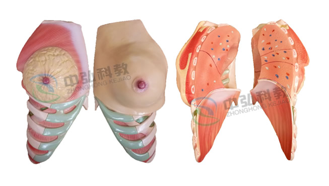 女性乳房解剖模型自然大,解剖可分左右2部件,顯示乳腺及輸乳管內(nèi)外兩面。