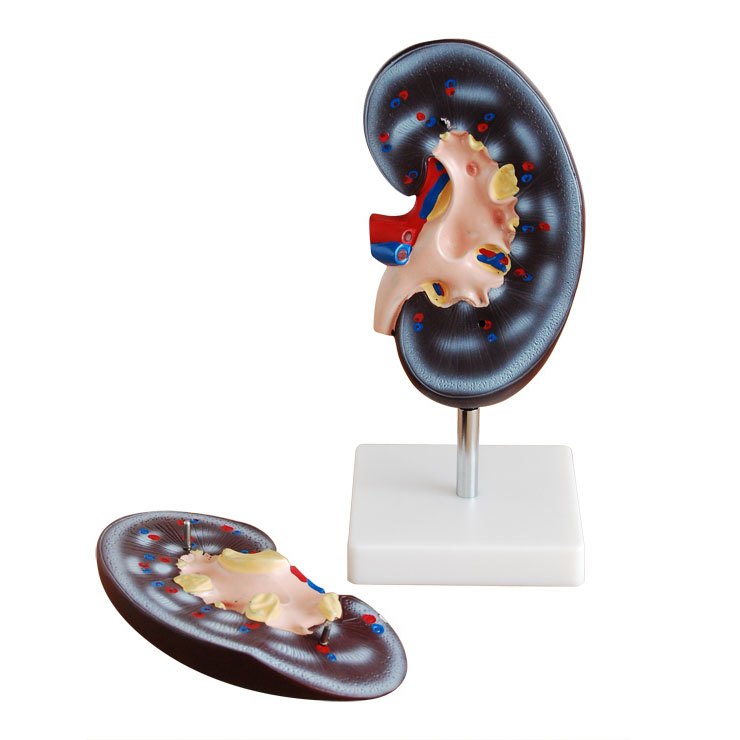 腎解剖模型右腎作額狀切面,示腎門、腎血管、輸尿管和腎盂、腎實質分髓質及皮質、錐體、乳頭等。