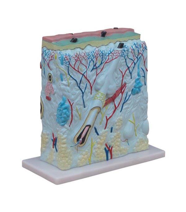 放大105倍的人體皮膚的橫截面模型。清晰地顯示了三層皮膚、頭發(fā)毛囊、汗腺、脂肪組織等。不可分割。用PVC制成,安放于塑料座上。尺寸: 27x10x31CM。