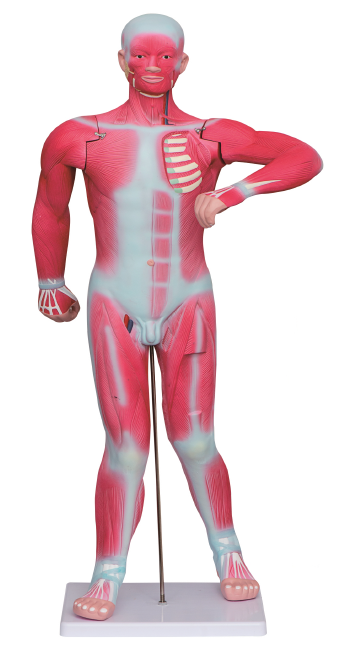 ■ ZH-D047A人體淺層運(yùn)動(dòng)肌肉解剖模型為成人直立運(yùn)動(dòng)姿勢(shì)縮小1/2,顯示人體淺層全部肌肉,可拆分為3部件,固定在底座上。■ 模型頭部示表情肌、淺層咀嚼肌、胸鎖乳突肌和淺層肌上下肌群。■ 軀干前部可見(jiàn)胸大肌、前鋸肌、腹外斜肌、腹直肌的輪廓,背部有斜方肌、背闊肌。■ 上肢顯示三角肌、肱二頭肌、肱三頭肌及前后各淺層肌肉、肌腱在腕部通過(guò)情況,并示腋窩各肌。■ 下肢顯示臀大肌、縫匠肌、股四頭肌、股二頭肌、半腱肌、半膜肌、股薄肌及股三角、腘窩的組成情況,小腿三群肌的淺層排列和肌腱通過(guò)踝部的情況。■ 尺寸:1/2自然大,35×23×82cm