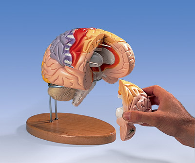 這款腦模型為實物的2倍大小,中切,可分解成4部分。前葉和腦干可拆卸。清晰展示了運動中樞、感覺中樞和功能中樞,并以色彩區(qū)分。帶有中文標注。置于可拆卸基架上。