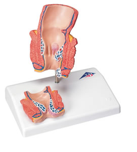這款模型用來為病人解釋痔瘡的病理。實物大小,展示了直腸的前段。另外在基座上還有一稍微縮小一些的模型。除了直腸的一些解剖結(jié)構(gòu)(肛門括約肌、粘膜、靜脈血管網(wǎng)),它表現(xiàn)了1期和2期的內(nèi)痔,以及外痔。另外的小模型展示的是3期和4期的痔瘡。置于基架上。