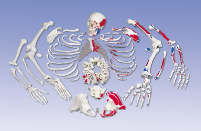 這款特殊模型手工著色、編號(hào)。左半邊肌肉源用紅色,而附著肌用藍(lán)色。右半邊所有骨頭和骨結(jié)構(gòu)如裂縫、骨孔和骨突均用手工編號(hào)。頭顱可拆卸成三塊。一只手和一只腳用尼龍線連接,另一套手臂和腿為松動(dòng)。附送多種語(yǔ)言解碼卡來(lái)解釋600多種編號(hào)的解剖結(jié)構(gòu)。用堅(jiān)實(shí)分格儲(chǔ)藏盒包裝供貨。
