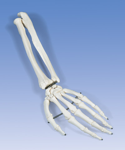 手骨骼,帶有部分尺骨和橈骨,不銹鋼絲緊連,左