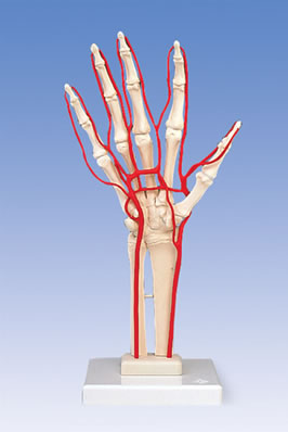 這款右手的模型實物大小,帶有橈骨和尺骨的詳解。顯示了掌淺弓和掌深弓,對于外科臨床研究必不可少。置于基架上。