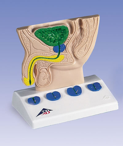 這款男性下體橫截面模型以圖解式描圖,實(shí)物一半大小展示了健康的前列腺帶膀胱、尿道、睪丸、陰莖、恥骨結(jié)合和直腸。通過四個橫截面可觀察到前列腺病變導(dǎo)致的尿道狹窄。帶有簡解彩圖。置于基架上。