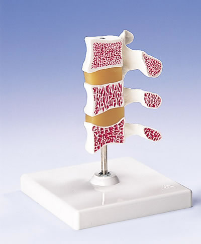 3塊中分腰椎,帶椎間盤。為作比較,上部為健康骨結(jié)構(gòu),中間為疏松骨組織,下部為帶平板變形和壓縮物質(zhì)的后階段疏松骨組織。椎骨可從基架上拆卸以便作細(xì)節(jié)研究。