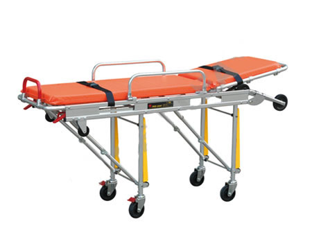 技術(shù)特點:上車時可分三檔調(diào)節(jié)高度,最低上車高度為64cm,適合不同高度的車廂;防水海綿墊,頭部可調(diào)節(jié),使病人舒適;配有保險鎖,運送病人時必須鎖上,上車時可以打開;折腿機構(gòu)可由兩邊把手控制;僅需一名救護人員可推上車;上車后可由固定裝置鎖在車箱底上;由高強度鋁合金制成,重量輕、便用安全、易清洗;主要適用于醫(yī)院、救護車、城市道路轉(zhuǎn)運病人。輪子尺寸:Φ150mm寬胎