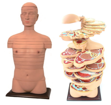 人體軀干橫斷斷層解剖模型以無性別人體軀干部為主體進(jìn)行水平斷面設(shè)計,將人體從頭頸部到盆部整個軀干分解成24片,頭頸部12片、軀干部12片,各層片可以水平向左右兩側(cè)移動并可以單獨取出,帶有多個部位數(shù)字指示標(biāo)志和對應(yīng)的文字說明。